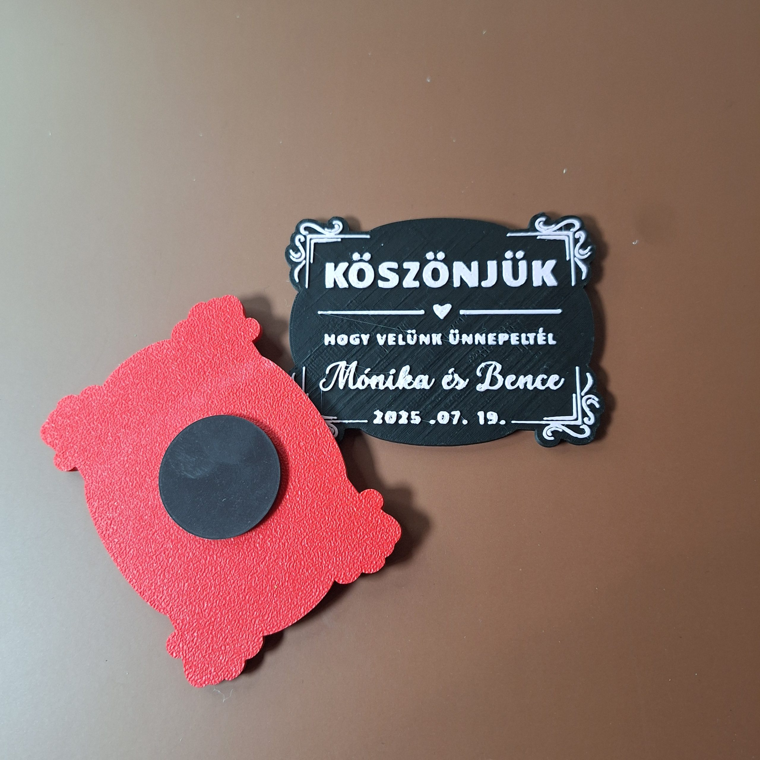 3 Színig szabadon variálható: Ellentétben a gravírozott termékekkel, itt akár három különböző színt is kombinálhatunk, így a mágnes tökéletesen illeszkedhet az esküvő dekorációjához vagy a virágok árnyalataihoz.